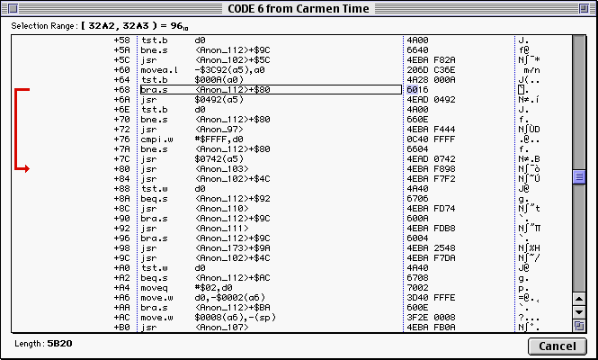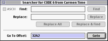 Now the clean crack is clear, we have to set a branch always (BRA) at CODE 6 +032A2. To do this, open the Carmen Time application in Resorcerer. Open the CODE 6 resource then Code > Goto/Find/Replace…. Type in the offset 32A2: